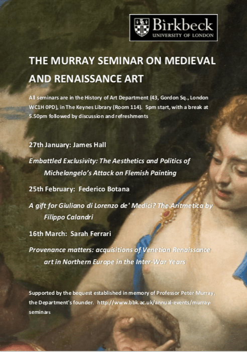 Seminars take place at 5pm in the History of Art Department (43, Gordon Sq., London WC1H 0PD) in The Keynes Library (Room 114), unless stated otherwise.