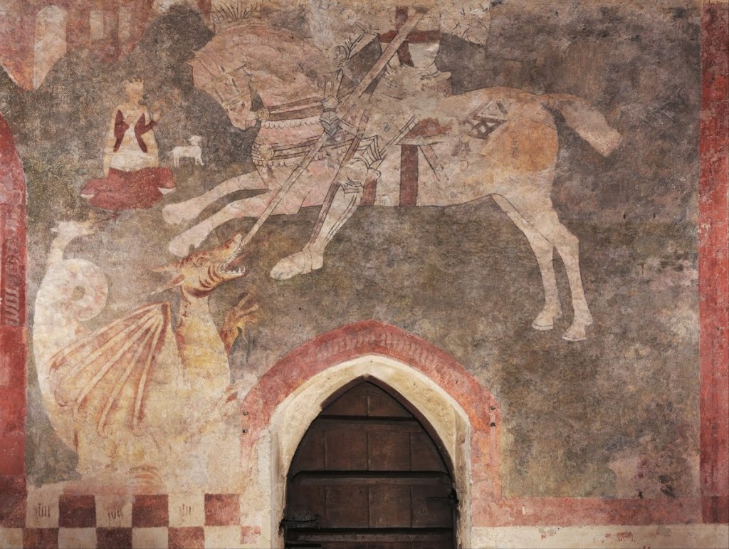 (Medieval wall painting of St George and the Dragon, 1410/1470, St Lawrence, Broughton, Buckinghamshire)