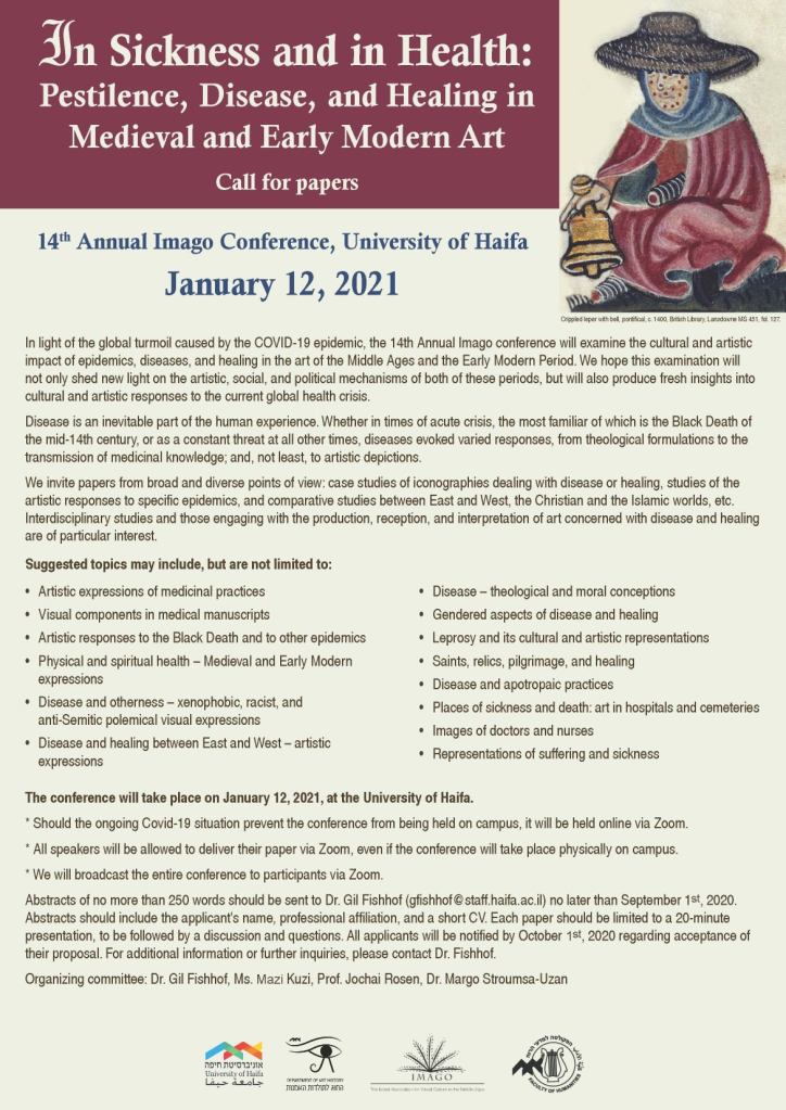 In light of the global turmoil caused by the COVID-19 epidemic, the 14th AnnuaI Imago conference will examine the cultural and artistic impact of epidemics, diseases and healing in the art of the Middle Ages and the Early Modern Period. We hope this examination will not only shed new light on the artistic, social, and political mechanisms of both of these periods, but will also produce fresh insights into cultural and artistic responses to the current global health crisis.