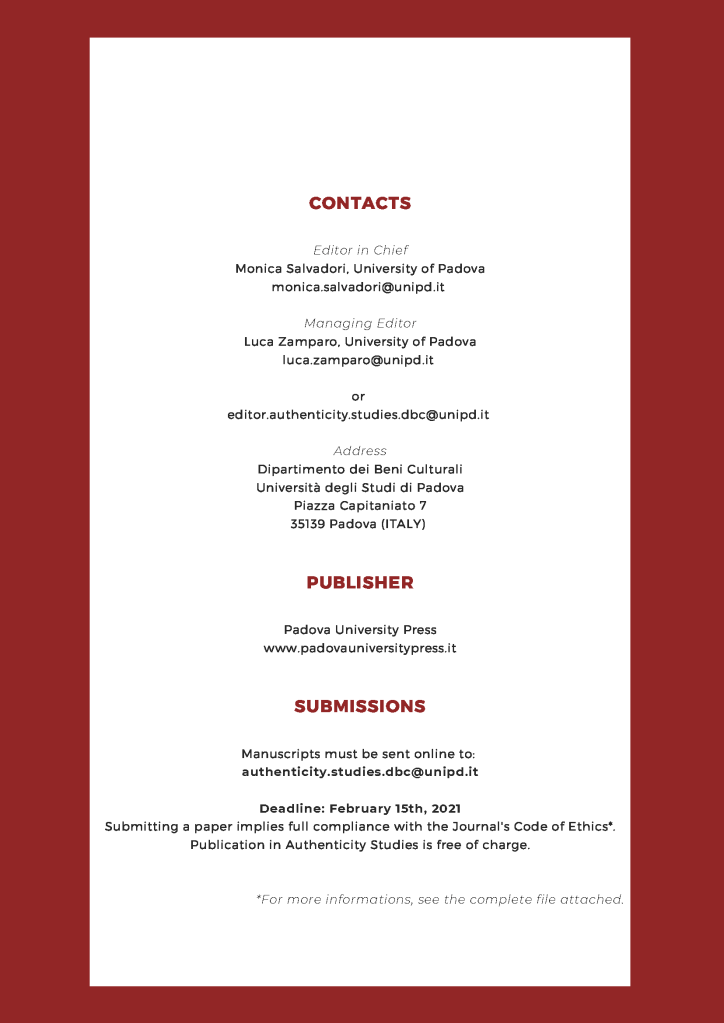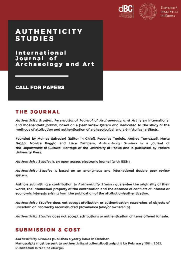 Authenticity Studies does not accept attributions or authentication of items offered for sale. Authenticity Studies publishes a yearly issue in October. Manuscripts must be sent to authenticity.studies.dbc@unipd.it by February 15th, 2021. Publication is free of charge.