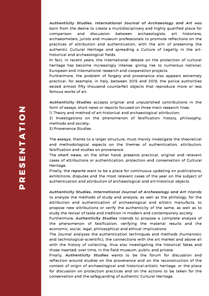 Authenticity Studies-International Journal of Archaeology and Art is an international and independent journal, based on a peer review system and dedicated to the study of the methods of attribution and authentication of archaeological and art-historical artifacts.