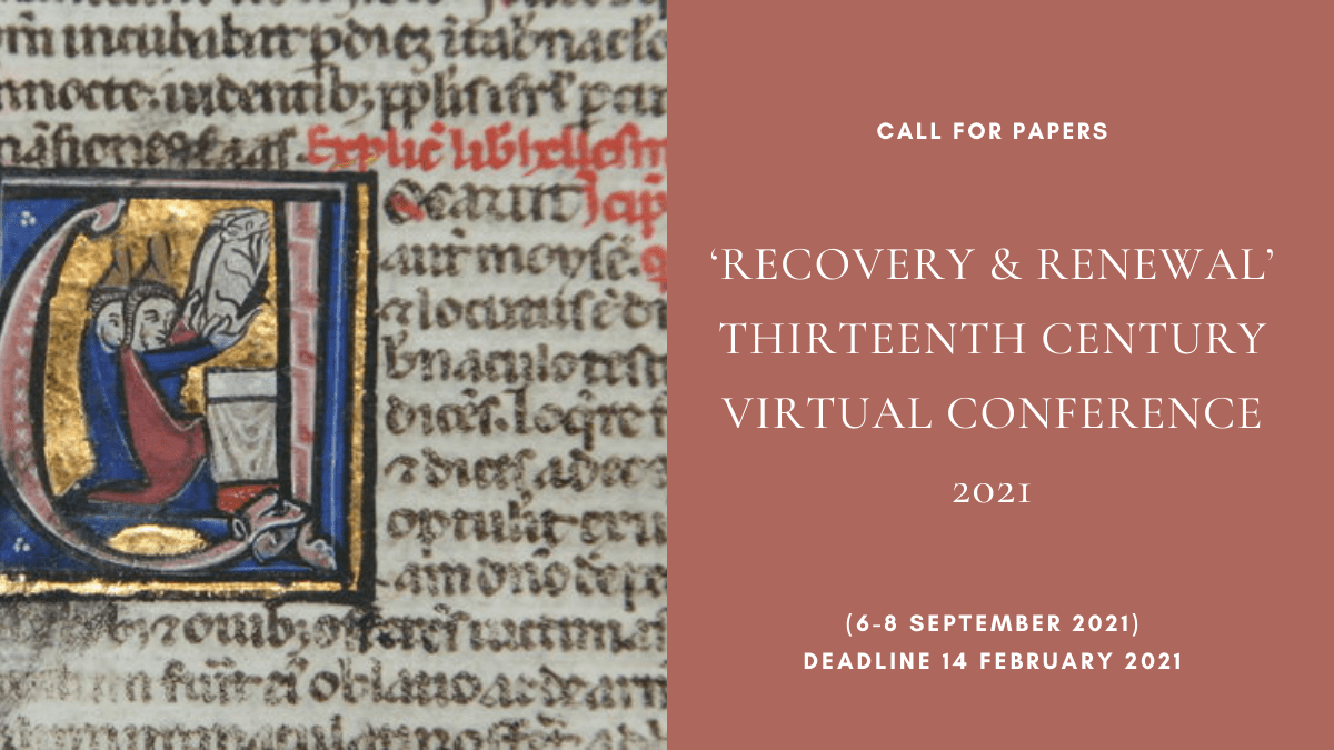 We are writing about this year’s Thirteenth Century Conference, which will run between 6 and 8 September 2021. We have taken the decision to go ahead with the conference, but in virtual form. Our reasoning for taking an early decision on this is that we would rather plan for a virtual conference from the outset than plan for an in-person event and be forced to re-arrange it at the last minute. Taking this decision early means that we can optimise the format and, we hope, run a really good conference, with potentially the opportunity for more people than usual to join us. If it does turn out to be possible to meet in person, we will explore creating a hybrid conference in which we have both in-person and virtual delegates.