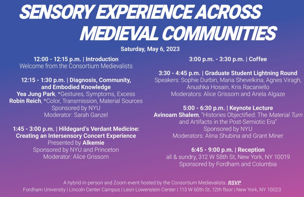 The Consortium Medievalists is excited to invite you to our 2023 symposium, Sensory Experiences Across Medieval Communities, on May 6! Find the flyer below for the full list of panels, talks, and performances. This year’s symposium will be held hybridly at Fordham University Lincoln Center Campus, and via Zoom. Please R.S.V.P here.