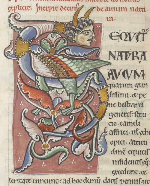 Large zoo-anthropomorphic initial from the Historia naturalis of Pliny the Elder, Arundel MS 98, f. 85v