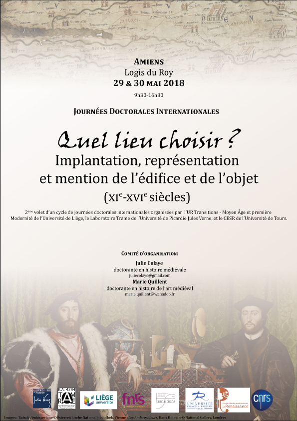 Journées doctorales internationales – « Quel lieu choisir ? Implantation, représentation et mention de l’édifice et de l’objet (XIe-XVIe siècles) » – Amiens 29 et 30 mai 2018 [FR et EN] Le laboratoire Trame (Textes, représentations, archéologie et mémoire de l’Antiquité à la Renaissance) de l’Université de Picardie Jules Verne s’est associé à l’UR Transitions. MoyenContinue reading “Colloquium: International graduate student colloquium in Amiens (May 29th – 30th 2018)”