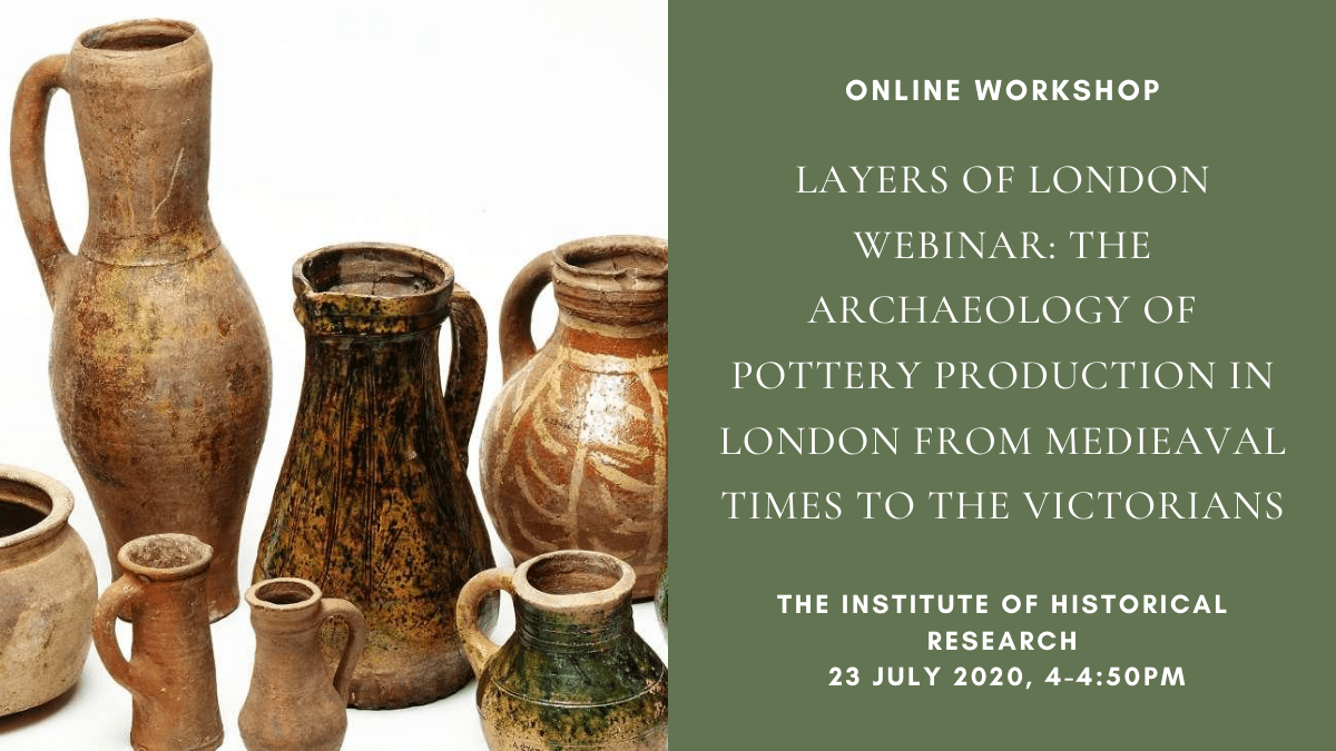 Online Workshop: Layers of London Webinar: The Archaeology of Pottery Production in London from Medieaval times to the Victorians, The Institute of Historical Research, 23 July 2020, 4-4:50pm