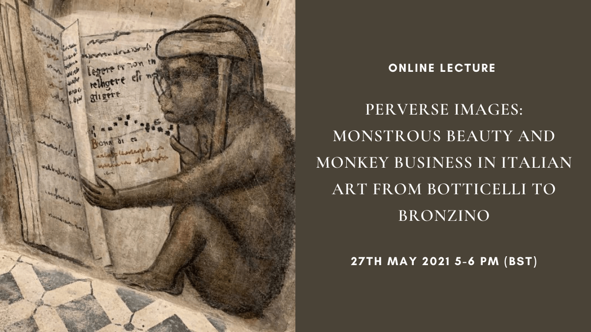 In canto 29 of Dante’s Inferno a notorious alchemist, consigned to the depths of Hell among the fraudulent, boasts of having been a successful ape of nature (“di natura buona scimia”). The boast allies imitation with counterfeiting and points to the way that representational truth to nature is inherently false. This talk takes the presence of monkeysContinue reading “Online Lecture: ‘Perverse Images: Monstrous Beauty and Monkey Business in Italian Art from Botticelli to Bronzino’, by Professor Patricia Rubin, Kunsthistorisches Institut, Florence, 27 May 2021, 5-6 pm (BST)”
