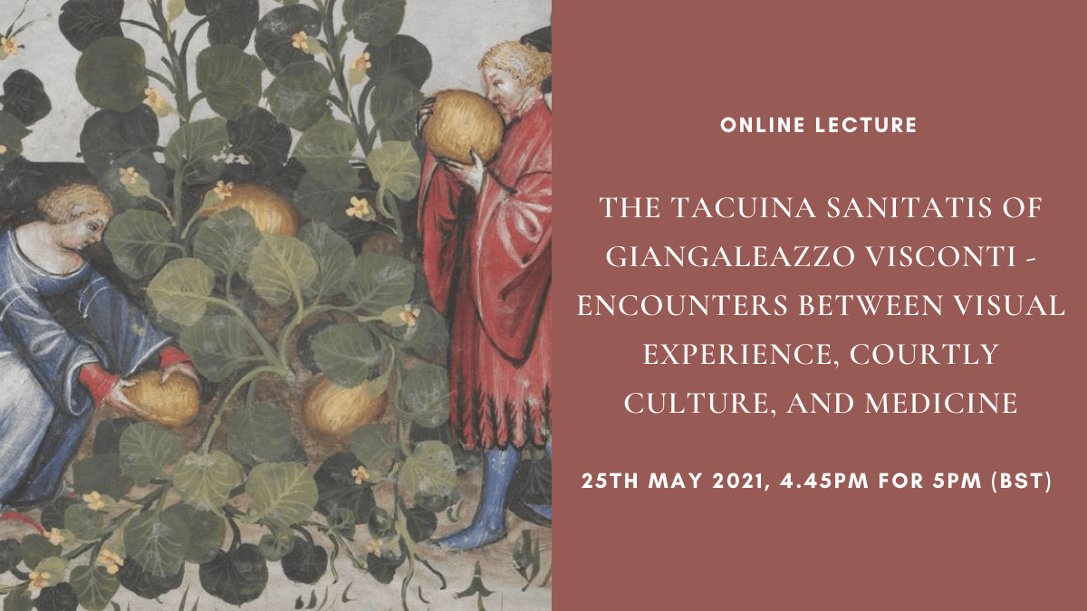 Four illustrated Tacuinum sanitatis (Tables of Health) manuscripts commissioned in the late fourteenth century by Giangaleazzo Visconti, Count of Milan and Pavia, pioneered a genre of books based on empirical experience. The manuscripts assimilated the eleventh-century Arabic medical and dietary knowledge of the tract Taqwīm al-ṣiḥḥa (Restoration of Health), itself a ground-breaking work, combining this with new formats andContinue reading “Online Lecture: The Tacuina Sanitatis of Giangaleazzo Visconti – encounters between visual experience, courtly culture, and medicine, Dominic Olariu, Murray Seminars at Birkbeck, 25th May, 4.45pm for 5pm (BST)”