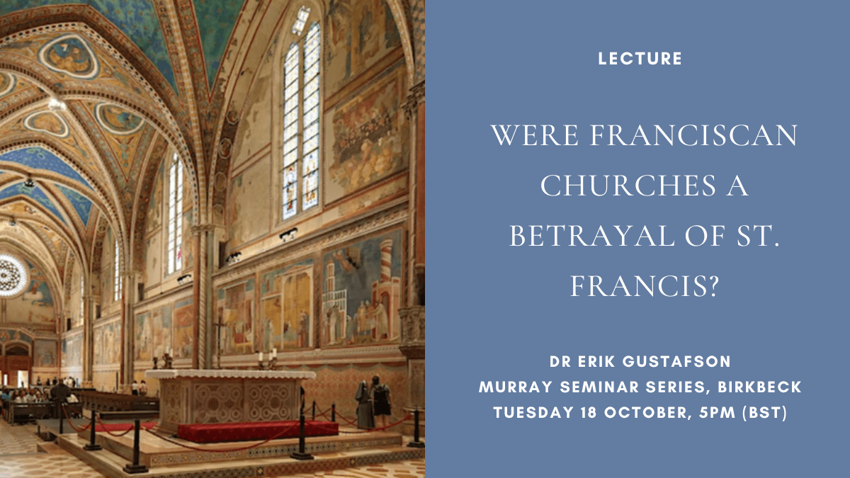 Lecture: ‘Were Franciscan Churches a Betrayal of St. Francis?’, Dr Erik Gustafson, Murray Seminar Series, Birkbeck, Tuesday 18 October, 5pm (BST)