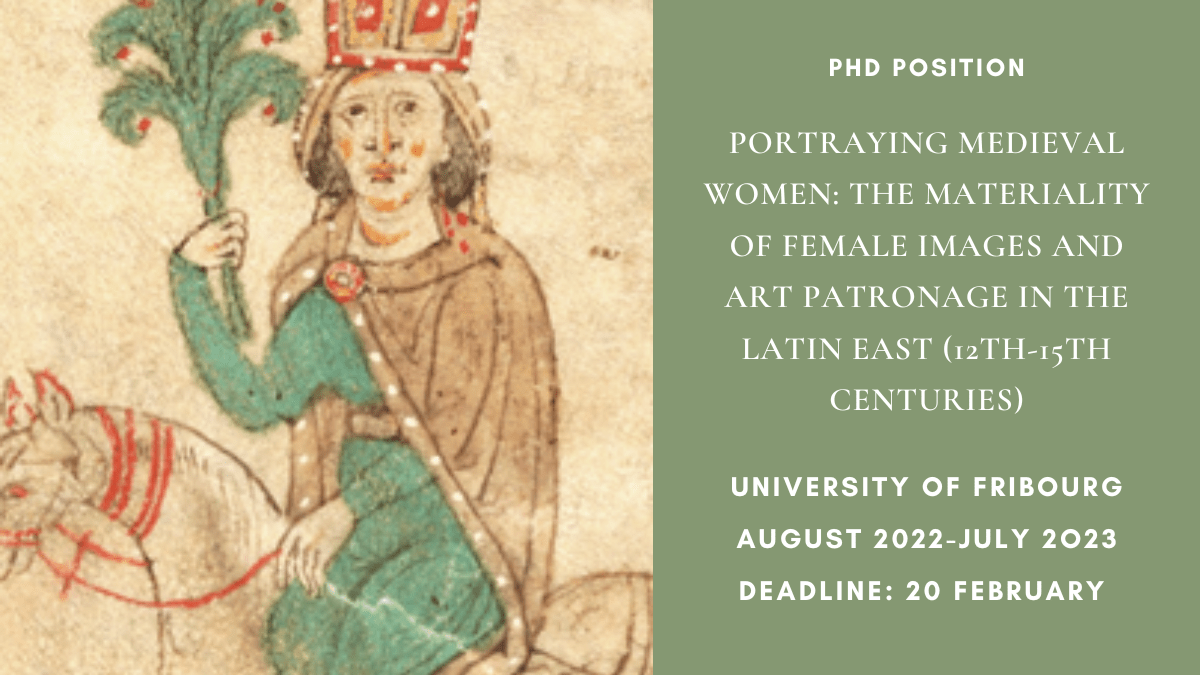 Description: The SNSF PRIMA Project Portraying Medieval Women: The Materiality of Female Images and Art Patronage in the Latin East (12th–15th centuries) (https://data.snf.ch/grants/grant/208477), hosted at the Chair of Medieval Art History at the University of Fribourg, offers a four-year doctoral position focused on female representations and patronage in Southern Italy under Latin rule (12th–15th century). Her/his dissertation will beContinue reading “PhD Position: Portraying Medieval Women: The Materiality of Female Images and Art Patronage in the Latin East (12th-15th centuries). University of Fribourg. (Deadline: February 20th, 2023)”