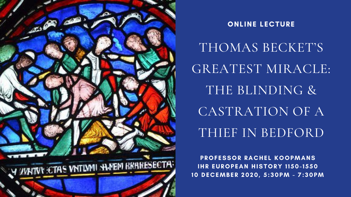 Online Lecture: ‘Thomas Becket’s Greatest Miracle: The Blinding and Castration of a Thief in Bedford’ with Professor Rachel Koopmans, IHR European History 1150-1550, 10 December 2020, 5:30-7:30pm (GMT)