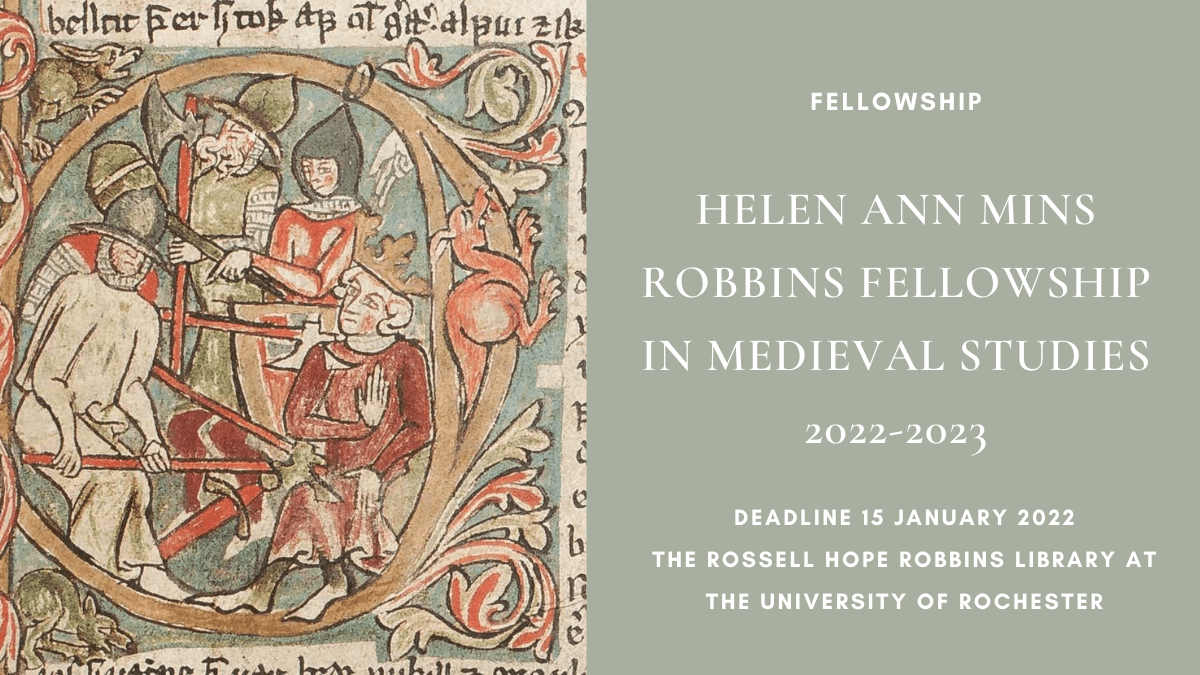Fellowship: Helen Ann Mins Robbins Fellowship in Medieval Studies 2022-2023, The Rossell Hope Robbins Library at the University of Rochester, deadline 15 January 2022