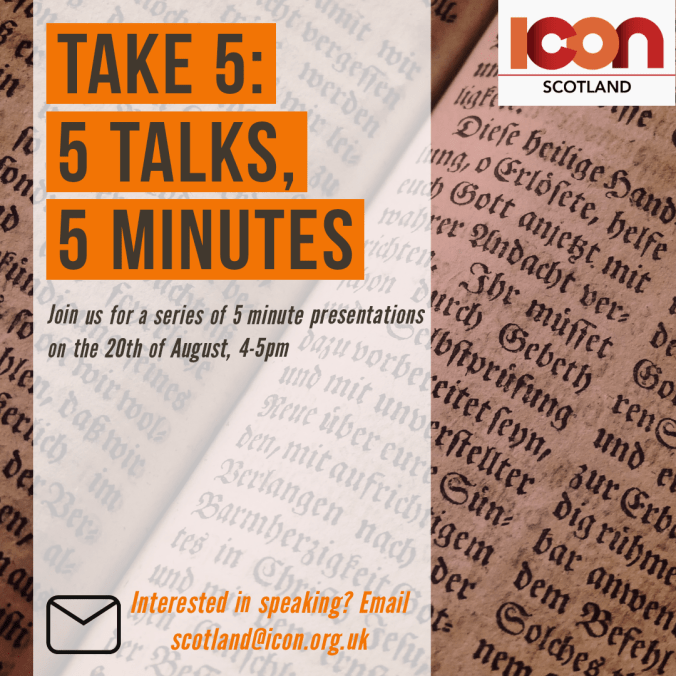 Call for Speakers: ICON Scotland Take 5: 5 speakers | 5 talks | 5 minutes (20 August 2020), deadline 31 July 2020