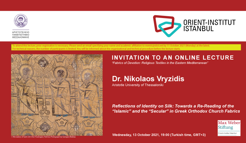 This lecture is part of the lecture series “Fabrics of Devotion: Religious Textiles in the Eastern Mediterranean”, convened by Esther Voswinckel Filiz (Orient-Institut Istanbul).